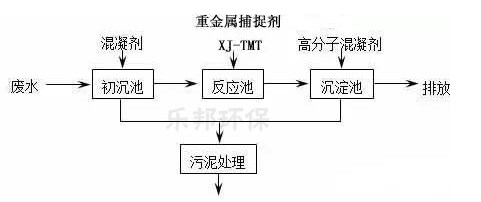 将重金属废水pH值调节为一定碱性后,再通过向重金属废水中投加有机硫XJ-TMT15等重金属捕捉剂,XJ-TMT是一种重要的重金属离子处理剂,能与水溶液中的大多数一价和二价的重金属等离子反应,形成稳定的化合物而沉淀出来,然后通过过滤分离,从而达到去除重金属离子的目的。重金属捕捉剂反应所产生的沉淀物,絮凝大,易于过滤;稳定性好,不易再次分解。应用范围颇为广泛。