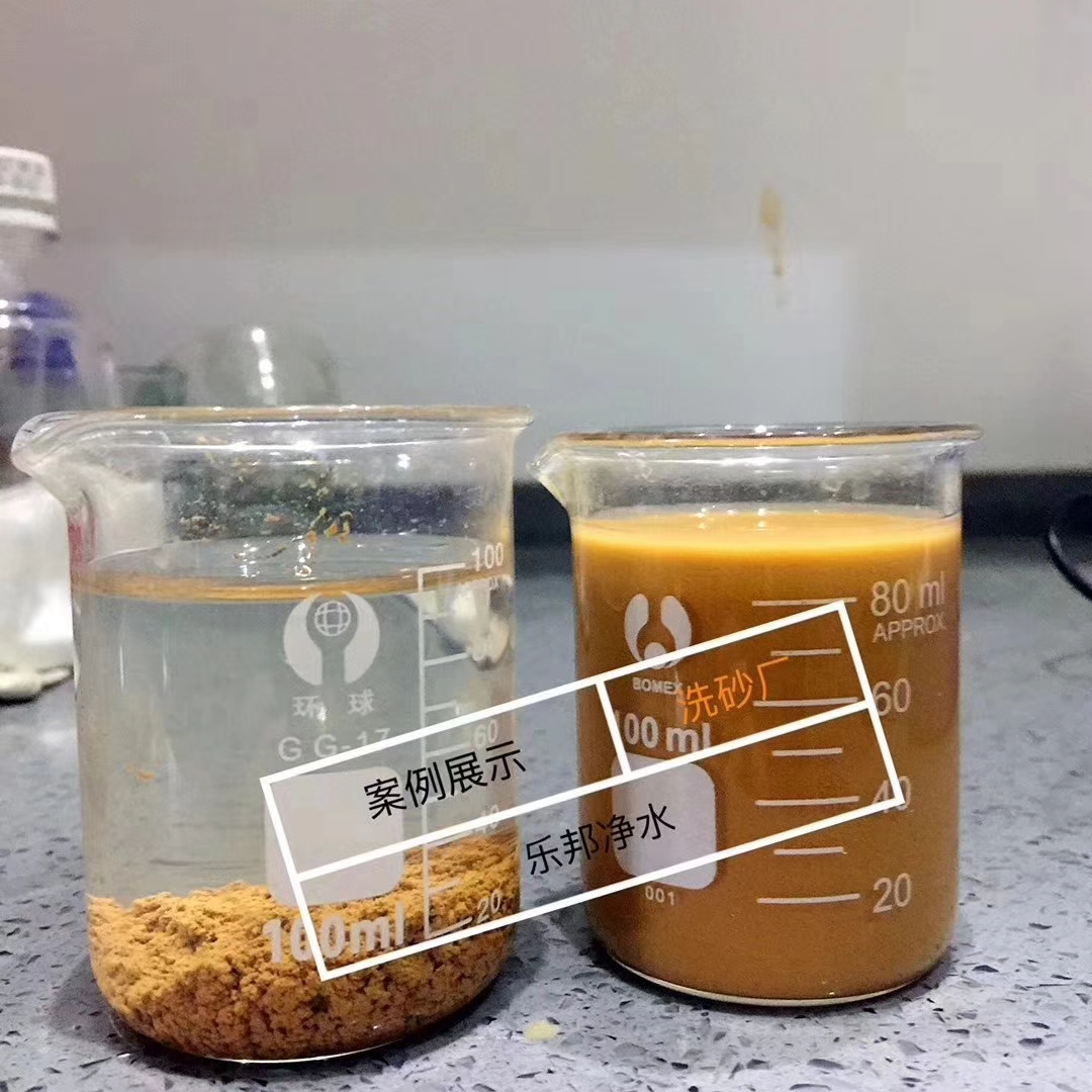 由于洗砂废水含泥沙量较大,先用初沉池自然沉降的办法将细沙沉淀下来,进而控制进入加洗砂用聚丙烯酰胺环节的含固量,以达到降低药剂成本投资的目的,然后通过添加絮凝剂,形成颗粒沉淀,上清液进入清水池回用,下层淤泥进入污泥脱水设备,泥饼外运处置。针对洗砂污水特性以及洗砂厂日常生产情况所需,需要使用洗砂用聚丙烯酰胺进行处理。不但效果好,且可以有效净化洗砂污水中的泥沙、悬浮物等。